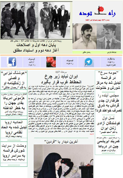 هفته نامه راه توده - شماره ۸۸۷ (چهارشنبه ۱۴ تیرماه ۱۴۰۲)- منتشر شد و مطالب آن علاوه بر سایت این نشریه، روی کانال تلگرام و فیسبوک راه توده نیز قرار گرفت. سرمقاله این شماره نگاهی  است به سقوط جهان غرب و برآمدن جهان شرق. گزارش ویژه نیز اختصاص به فصل دیگری از کتاب "رویدادهای ایران از انقلاب مشروطه تا انقلاب ۵۷ دارد که دراین شماره مقایسه دو دهه متفاوت حکومت رضاشاه مطرح شده است. در همین شماره مطالب دیگری می خوانید با عناوین زیر: